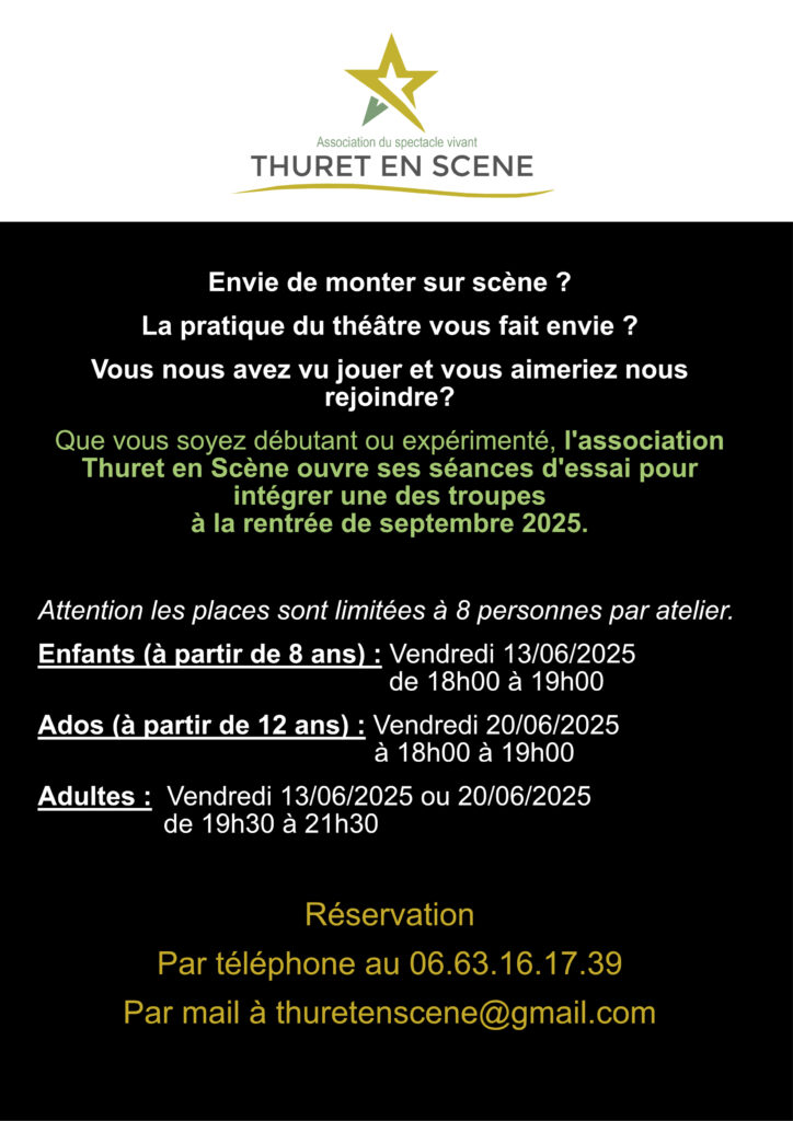 Envie de nous rejoindre? Nous vous proposons une séance d’essai au mois de juin 2025 avec la possibilité de vous préinscrire pour le début des ateliers théâtre à la rentrée de septembre 2025.